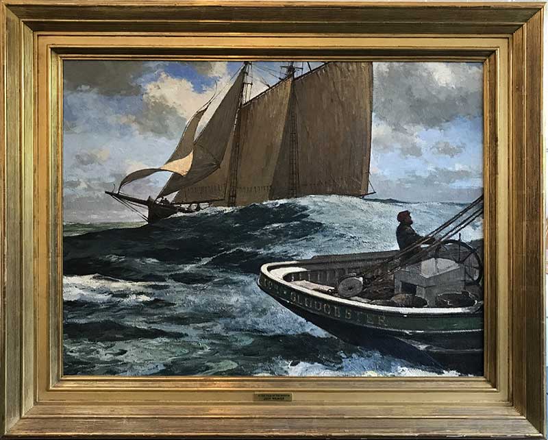 A fine commissioned work from the artist’s period when he depicted the golden days of the Gloucester fishing schooner fleet, and, as here, their races to be the first home with their catch from the Grand Banks.